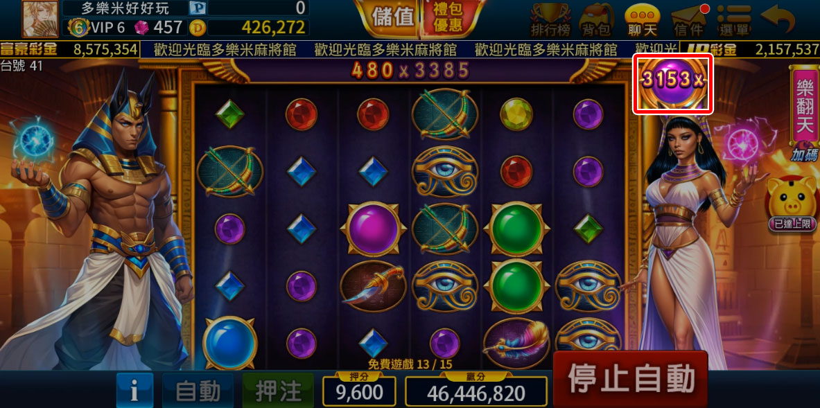 每次有贏分且盤面有倍數物件時,當局贏分=贏分*(盤面倍數+總倍數)。