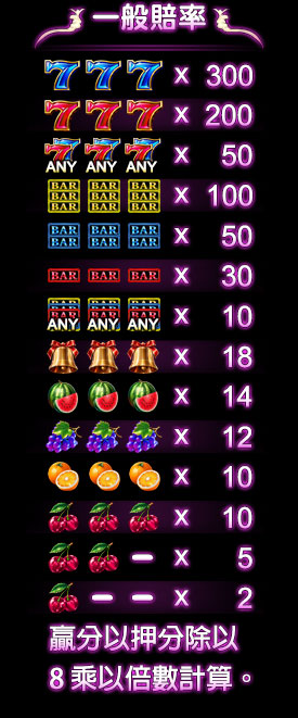 ● 遊戲內【押分】欄位顯示的分數,即為玩家 8 條連線下注的總金額,除以 8 即為每條連線的下注金額。