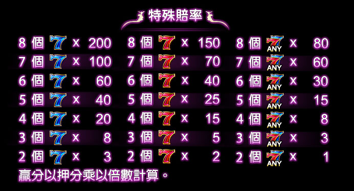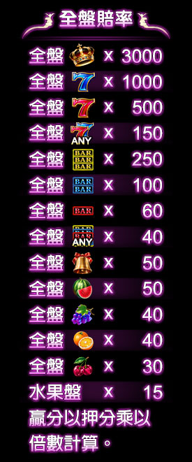● 達成指定賠率的圖案連線,或是獲得全盤相同圖案,即可獲得相對應的賠率獎金。