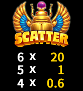 ●同時出現在主遊戲、免費遊戲中。 ●4至6個 可獲得15次免費遊戲。●免費遊戲中獲得3至6個 可額外獲得5次免費遊戲最多可獲得100次。