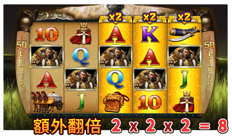 除外) 於黃金輪上,可獲得額外 2 倍翻倍獎勵,最高可得到 3 個黃金輪共 8 倍獎勵。●免費遊戲中出整排黃金輪,將鎖定黃金輪,直到免費遊戲結束。